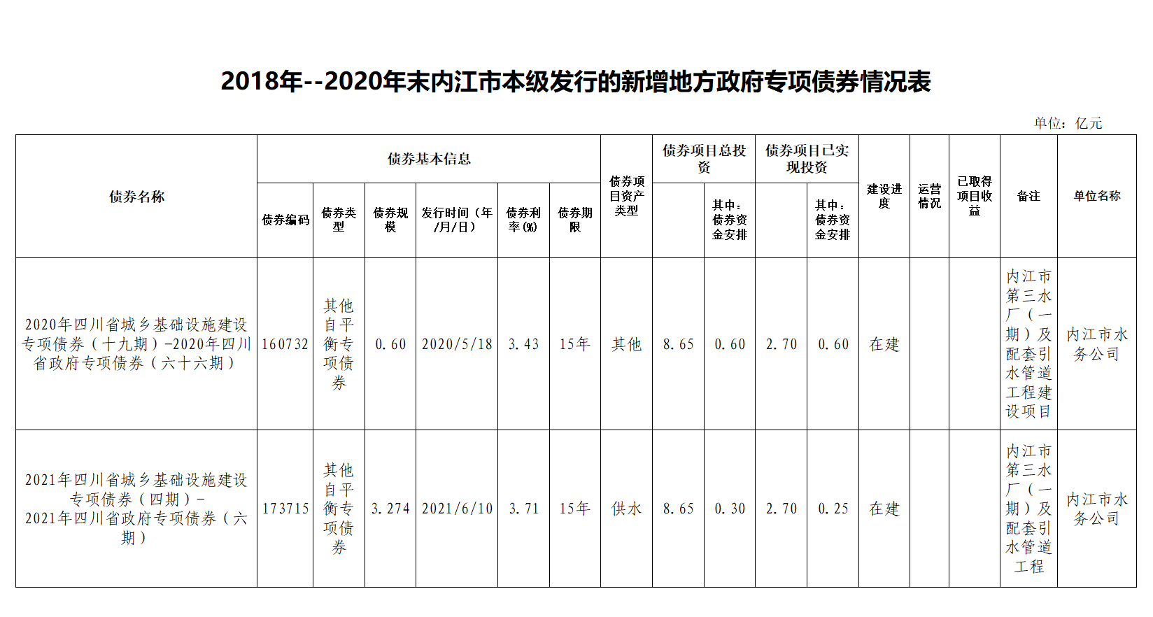 2018年--2020年末內江市本級發行的新增地方政府專項債券情況表