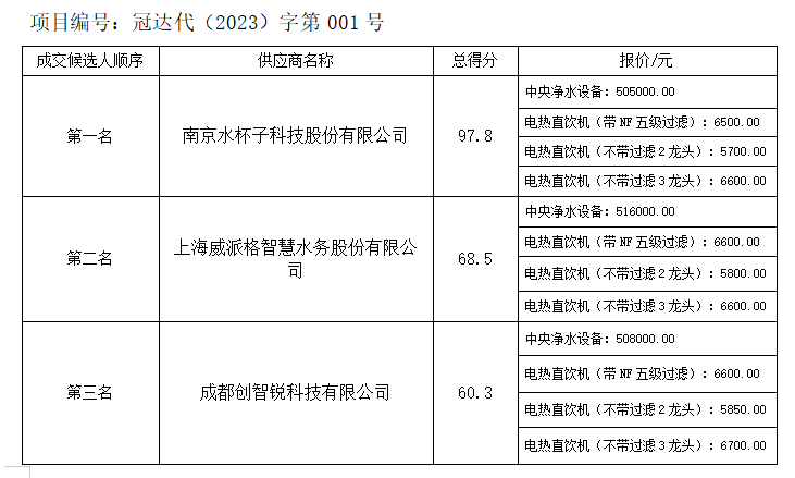 內(nèi)江市水務(wù)有限責(zé)任公司內(nèi)江高級技工學(xué)校管道直飲水成套設(shè)備及附件采購(含安裝)項(xiàng)目競爭性磋商結(jié)果公示