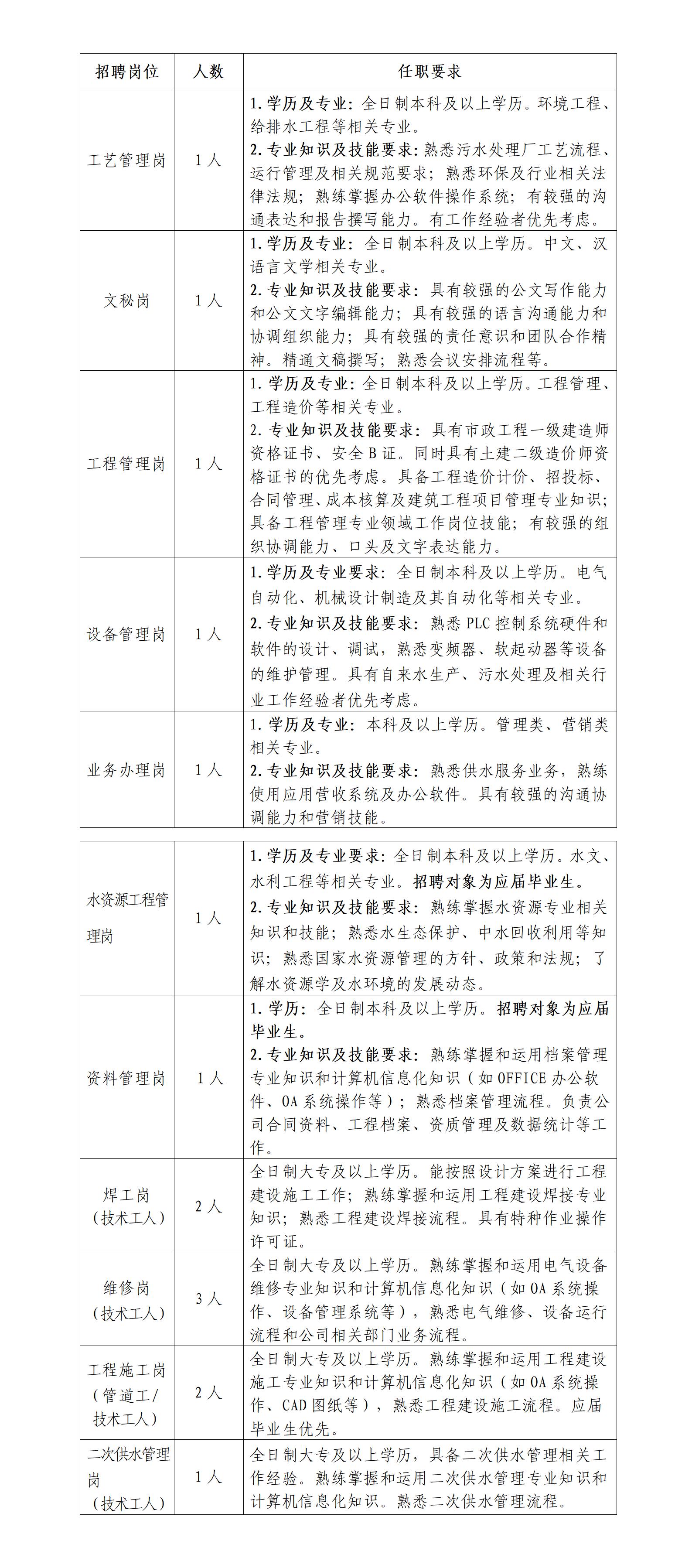 內江市水務有限責任公司系內江市國資委所屬內江投資控股集團有限公司的全資子公司。是集城市供水、污水處理、供排水工程設計、工程施工為一體的國有獨資市政公用骨干企業。為滿足公司高質量發展對人才的需求,特面向社會公開招聘相關人員?,F將招聘事項公告如下。