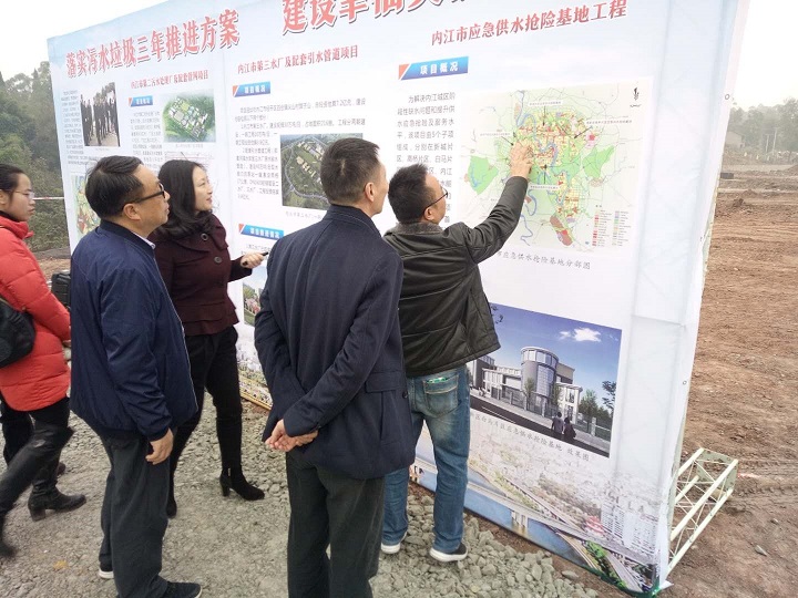 11月28日,省環境保護廳副巡視員姚東升一行到內江,對落實污水垃圾三年推進方案落實情況進行調研。調研組先后來到了桐梓壩大橋至壽溪河口綜合環境整治工程、謝家河黑臭水體整治、東興區垃圾壓縮站及環衛車輛專用停車場,最后來到我司第二污水處理廠建設施工現場進行實地調研。公司黨委副書記、紀委書記、工會主席李濤在《落實污水垃圾三年推進方案,建設幸福美麗內江》展板前對項目推進情況作了詳細匯報,并報告了下一步工作計劃。